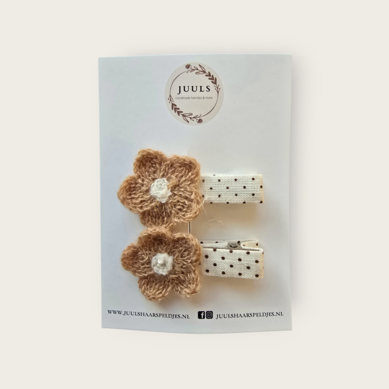 2 hele leuke gehaakte bloemetjes bevestigd op een bekleed alligator clipje van 4,5cm.
